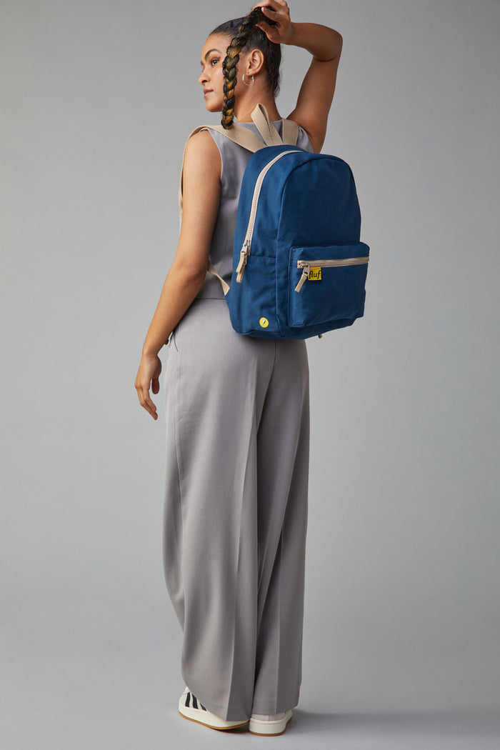 Classic, mid-sized backpack for school, work or day trips. Durable, sturdy organic cotton canvas with exterior water bottle pocket. Interior pocket / sleeve for 15” laptop. Machine washable. Sustainably and ethically made with organic + recycled materials.