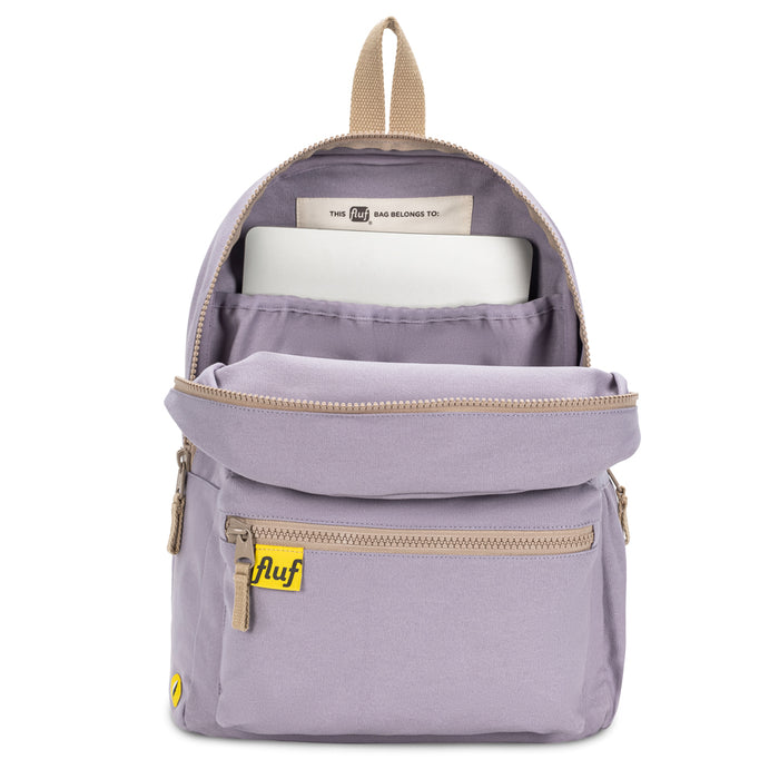 Classic, mid-sized backpack for school, work or day trips. Durable, sturdy organic cotton canvas with exterior water bottle pocket. Interior pocket / sleeve for 15” laptop. Machine washable. Sustainably and ethically made with organic + recycled materials.