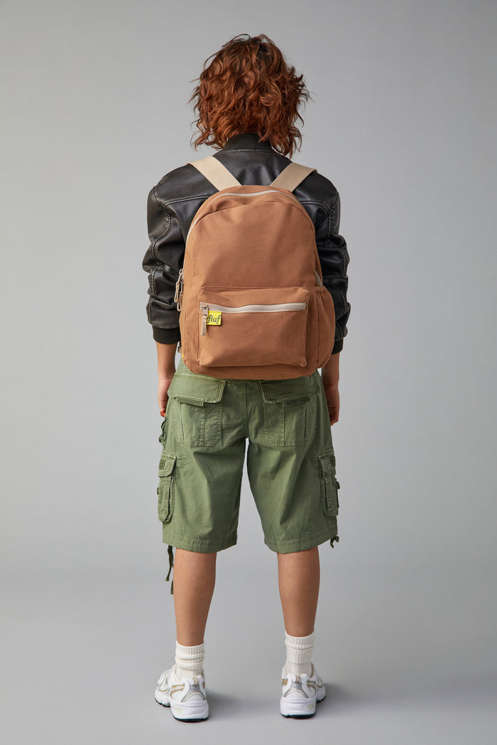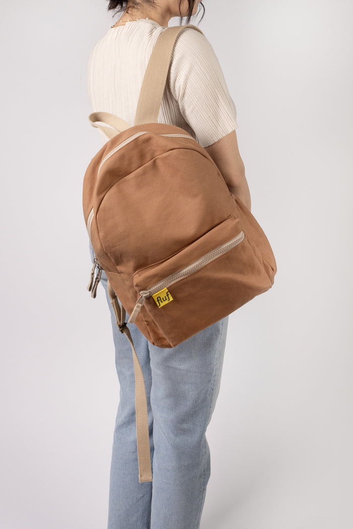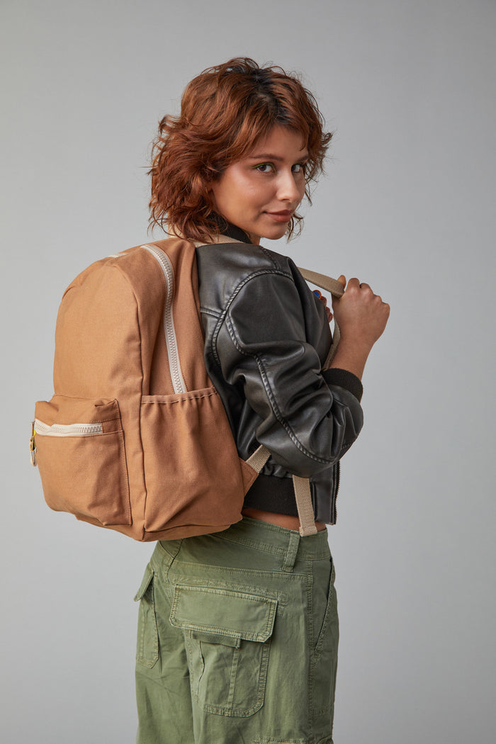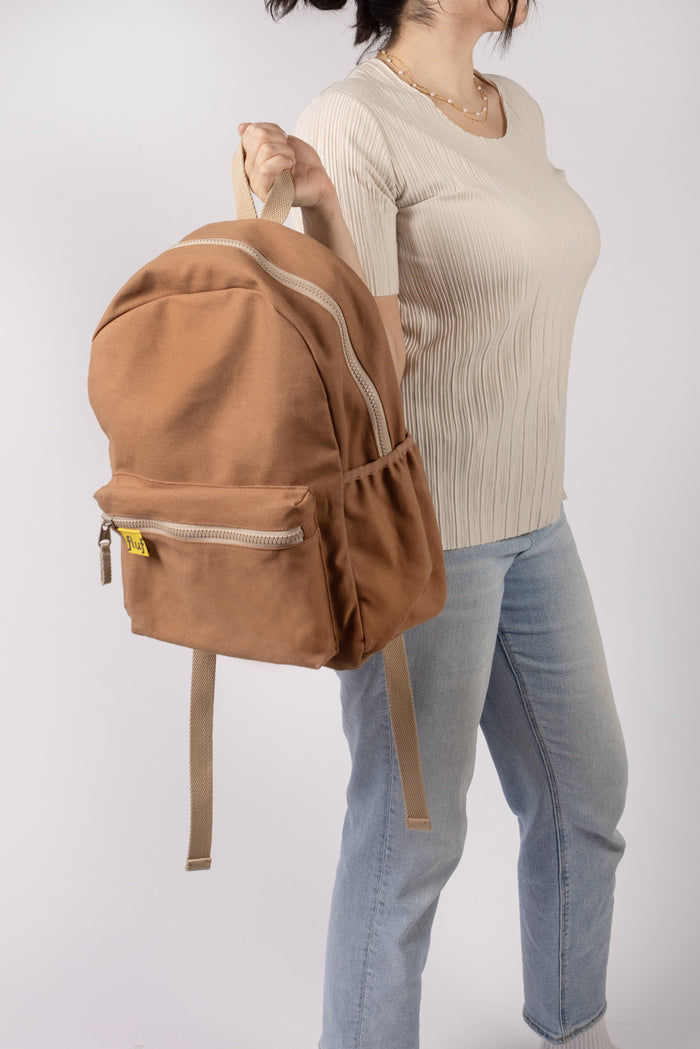 Classic, mid-sized backpack for school, work or day trips. Durable, sturdy organic cotton canvas with exterior water bottle pocket. Interior pocket / sleeve for 15” laptop. Machine washable. Sustainably and ethically made with organic + recycled materials.