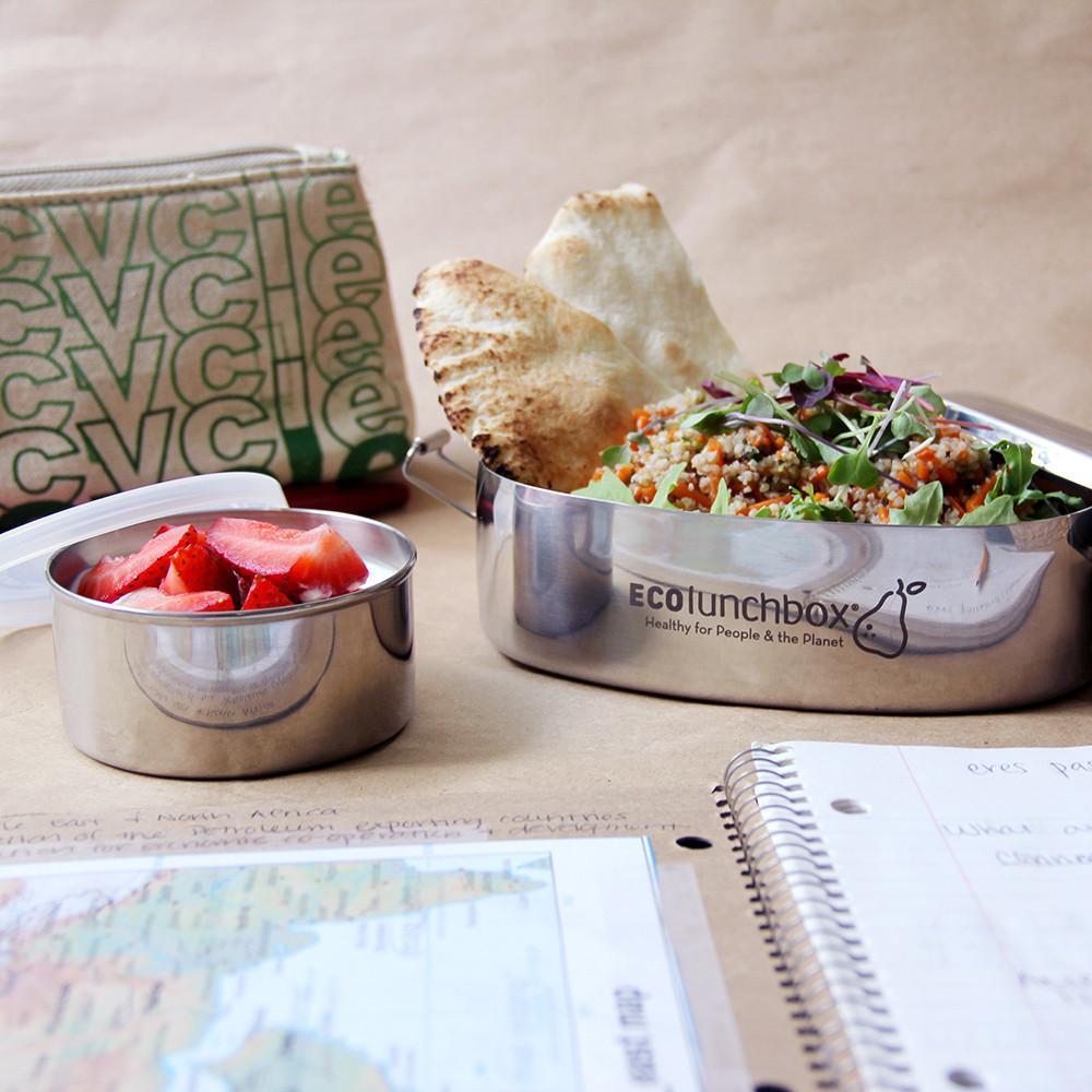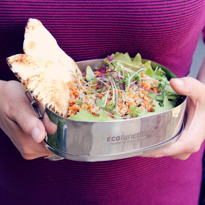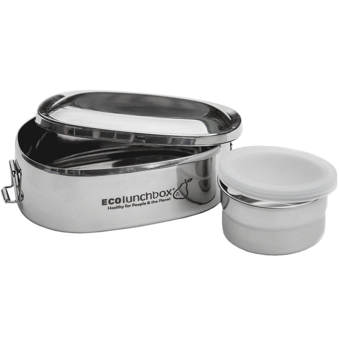 Ready to say goodbye to plastic with ECOlunchbox? The Oval & Snack Cup is a 2-piece set ideal for packing food to go or ordering zero-waste restaurant takeout. The Oval container is made entirely of steel and big enough to pack a medium-sized lunch for adults or children.
