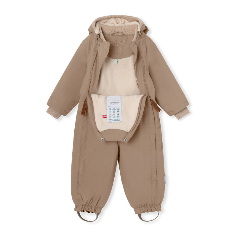 MINI A TURE suit for the little ones with 10-year guarantee. The suit has a front chest pocket, two zippers at the front, making it easy to get on and off, and comes with a soft, warm fleece lining. The waist can be adjusted with a hidden elastic on the inside, and the suit has a detachable hood with snap buttons. Sizes up to 18m/86 feature a rib collar for extra comfort, while sizes above have a regular collar. MINI A TURE reflex star in the front pocket. The suit is made from durable, recycled nylon, and is wind- and waterproof.