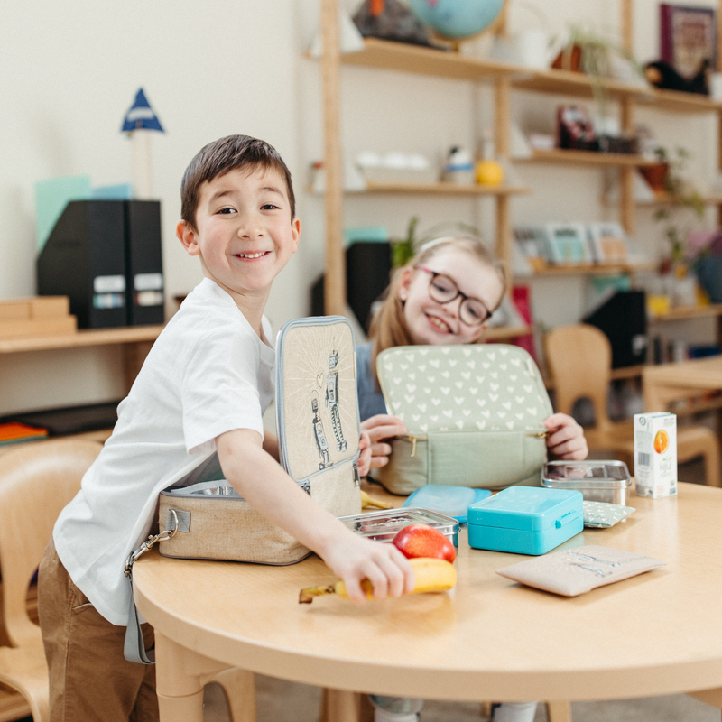 A shower of dainty Little Hearts on our signature Sage Green Linen reminds your little one that whether they are learning in the classroom or exploring on the playground, love is with them all day long.