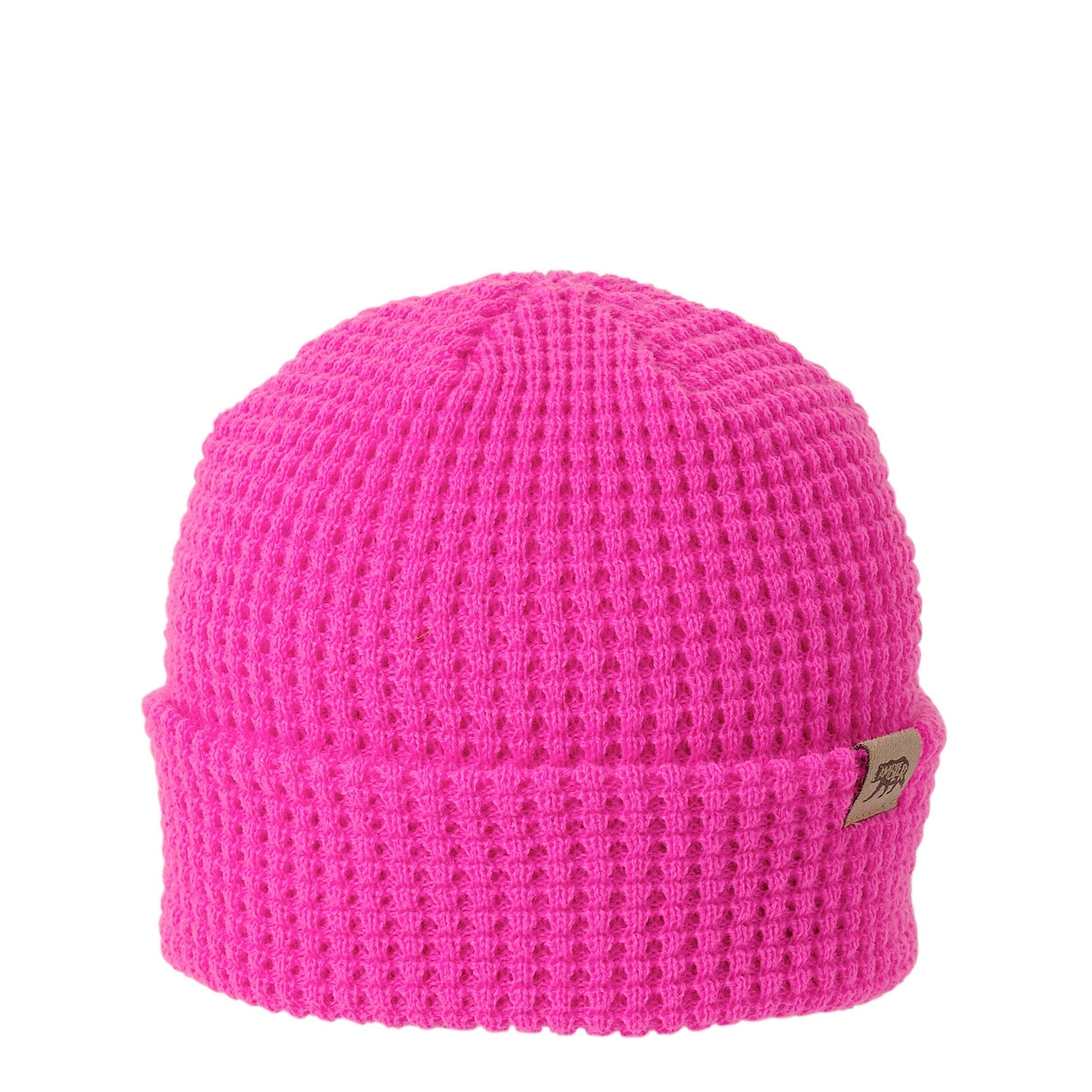 The Marley is a soft textured waffle knit toque with a folded cuff. It comes in awesome, bright colours and has a faux suede clip label with a bear on it.