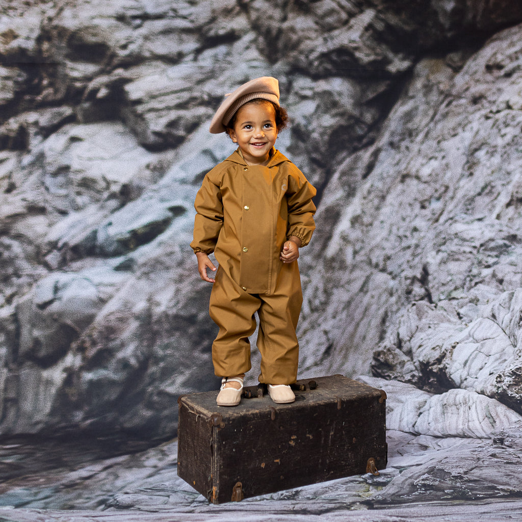 Providing head to ankle waterproof coverage, the Onesie Rainsuit is designed for little explorers. The roomy, attached hood allows for a hat during the colder seasons and air circulation when it’s warm. Soft elastic in the wrists and ankle cuffs help to keep things snug and the front flap provides additional coverage with brass snaps. This is an adorable option for parents who want their little ones to enjoy the natural world, whatever the weather.