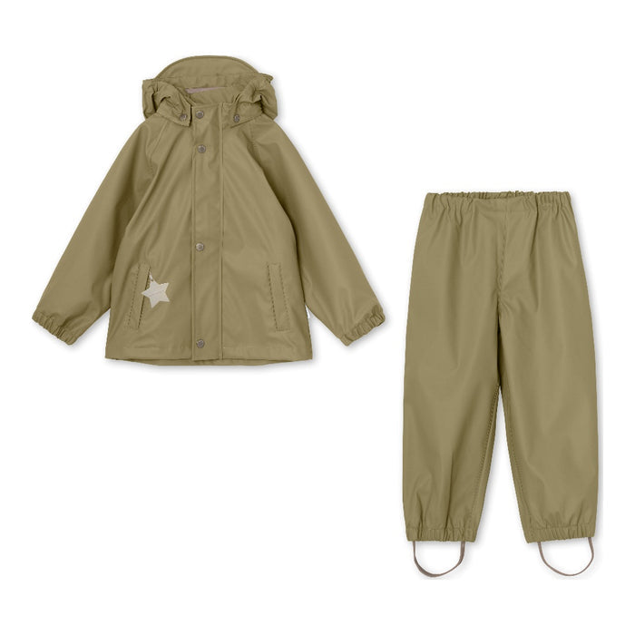 Rain set for children in a classic design with a simple rain jacket and rain pants. The hood is attached with snap buttons and can also get detached. The hood in the rain jacket also has a practical wide shade, so it protects the face from the rain. The rain pants have removable foot straps. The rain set is made from soft, recycled polyester.