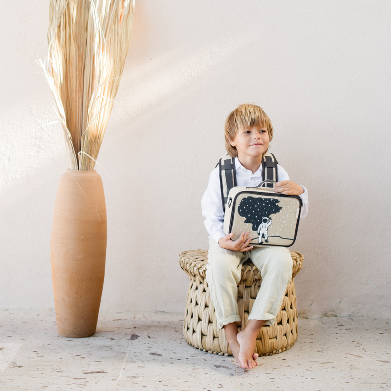 The perfect lunch companion, this kids' lunch box fits a bento box, small drink, a snack container, matching ice pack and more! Thoughtful features include an insulated interior, removable liner for easy cleaning, detachable straps and easy-to-carry handle.